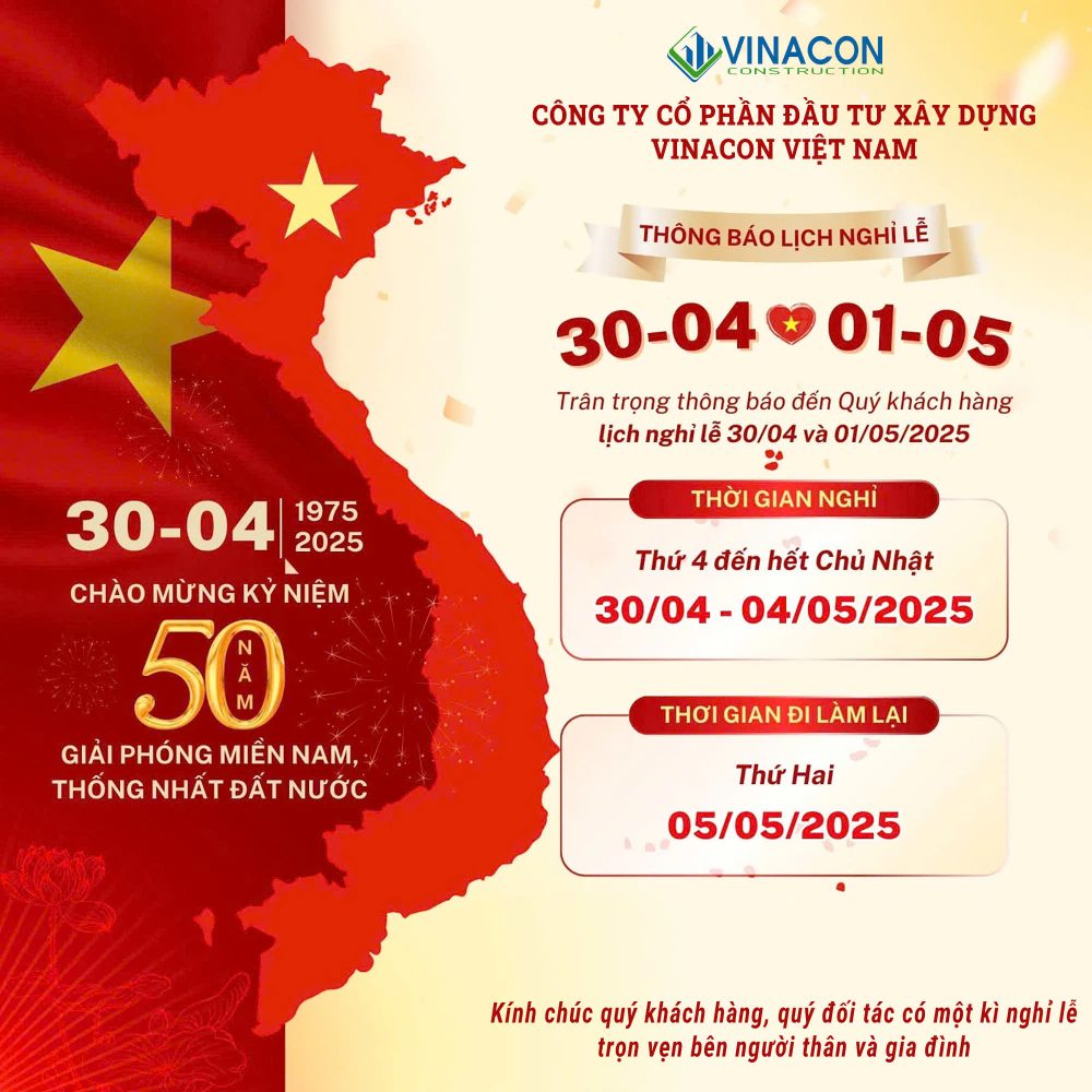 CÔNG TY CỔ PHẦN ĐẦU TƯ XÂY DỰNG VINACON VIỆT NAMTHÔNG BÁO(V/v: Nghỉ lễ Giải phóng miền Nam 30/04 và Quốc tế Lao động 01/05)